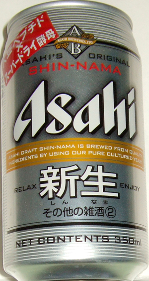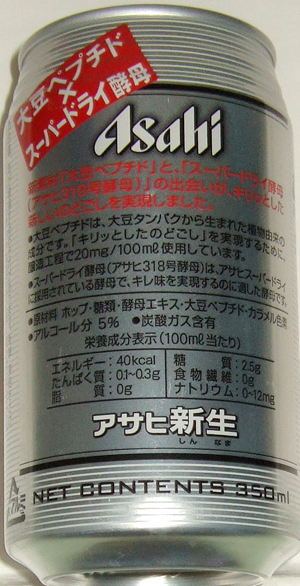 | 製造日 2005.4 | 大豆ペプチド×スーパードライ酵母 SHIN-NAMA RELAX ENJOY裏面 ASAHI DRAFT SHIN-NAMA IS BREWED FROM QUALITY INGREDIENTS BY USING OUR PURE CULTURED YEAST | |