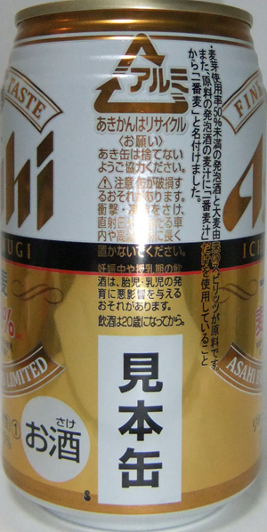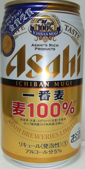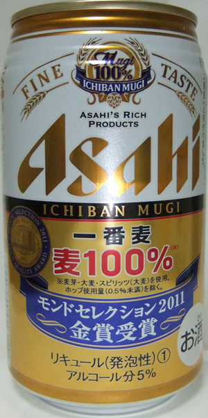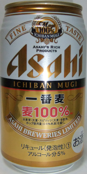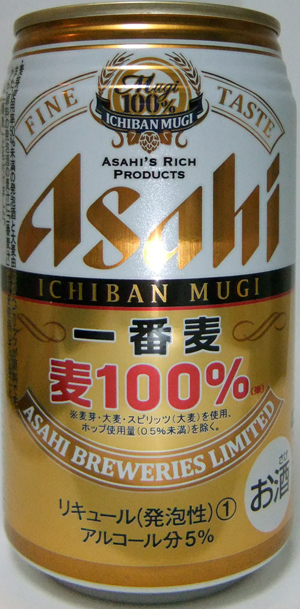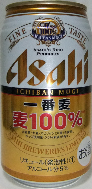 | 製造日 2012.8 | 麦100% リキュール(発泡性)@ アルコール分5% 麦芽使用率50%未満の発泡酒と大麦由来のスピリッツが原料です。また、原料の発泡酒の麦汁に「一番汁」だけを使用していることから、「一番麦」と名付けました。 2011.2版とは、下部の「ASAHI BREWERIES LIMITED」部分が変わりました。 | |