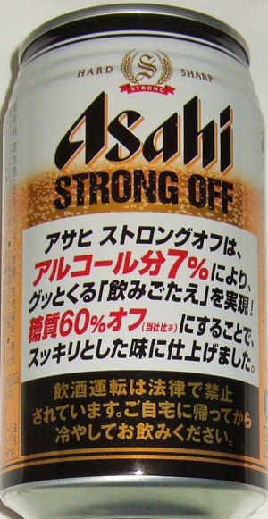 | 製造日 2010.3 | アサヒストロングオフは、アルコール分7%により、グッとくる「飲みごたえ」を実現!糖質60%オフにすることで、スッキリとした味に仕上げました。 飲酒運転は法律で禁止されています。ご自宅に帰ってから冷やしてお飲みください。側面 裏面 | |