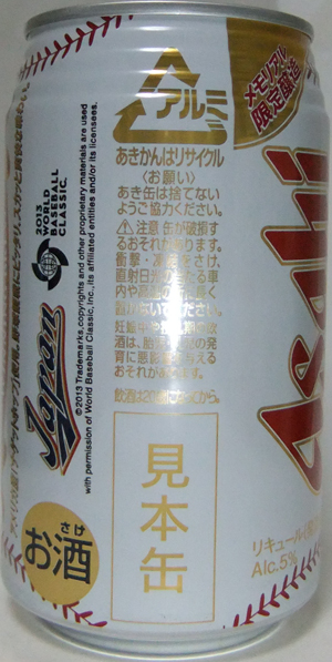 | 製造日 2012.11 | メモリアル限定醸造 2013 WORLD BASEBALL CLASSIC アメリカ産「ナゲットホップ」使用。野球観戦にピッタリ、スカッと爽快な味わい。正面 | |