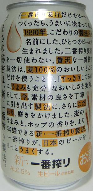 | 製造日 2013.12 | 一番搾り麦汁だけで、ビールをつくったら、うまいに決まってる。二番搾り麦汁を一切使わない、贅沢な一番搾り製法から生まれたのは、すっきりしているのに、うまみも充分なおいしさ。 そして今、さらに磨きをかけ、麦100%のうまみと、ホップの香りを、より実感できる新・一番搾り製法へ。表面 | |