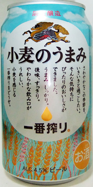| 製造日 2016.3 | 限定醸造 ALC.4.5% ビール 裏面さわやかなこの季節を、いきいきと過ごしたい。 そんな気持ちにぴったりのおいしさができました。うまみ、しっかり。後味、すっきり。やわらかな飲み口がうれしい。小麦を感じる一番搾りをどうぞ。 | |
