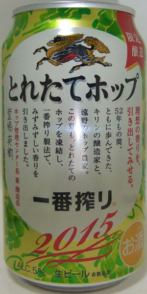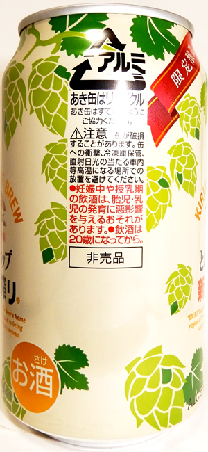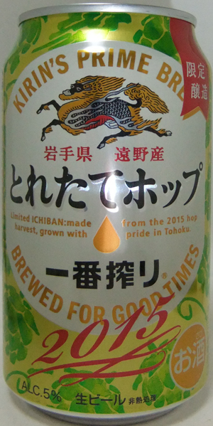 | 製造日 2015.10 | 岩手県遠野産 2015 限定醸造 裏面 理想の香りを、引き出してみせる。52年もの間、ともに歩んできた、キリンの醸造家と、遠野のホップ農家。この夏も、 とれたてのホップを凍結し、一番搾り製法で、みずみずしい香りを引き出しました。ホップ管理センター長 兼 醸造家 萱場英樹 | |