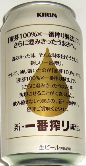 | 製造日 2009.2 | 「麦芽100%×一番搾り製法」で、さらに澄みきったうまさへ。澄みきった味。そんな味を出そうとした新しい一番搾り。 そして、辿り着いたのが「麦芽100%」です。 新・一番搾り誕生。裏面 | |