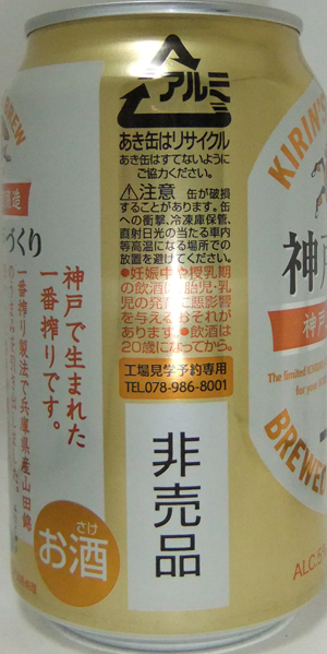 | 製造日 2015.5 | 神戸工場限定醸造 神戸で生まれた一番搾りです。 神戸工場醸造長 野口勝弘裏面 側面非売品 | |