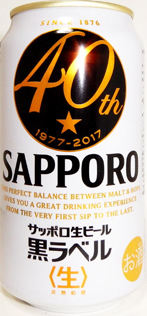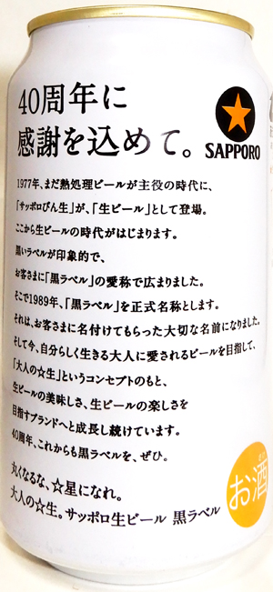 | 製造日 2017.11 | 1977-2017 裏面 40周年に感謝を込めて。丸くなるな、星になれ。大人の生。サッポロ生ビール 黒ラベル | |