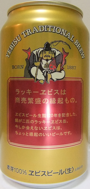 | 製造日 2010.7 | ラッキーヱビスは、商売繁盛の縁起もの。ヱビスビール生誕120年を記念した、鯛が二匹のラッキーエビス缶。今しか会えないヱビスは、 ちょっと縁起のいいビールです。裏面 | |