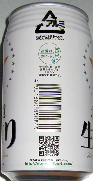 | 製造日 2006.2 | Hokkaido Namashibori http://namashibori.com/ 品質は畑から。サッポロビールの麦芽とホップは、100%協働契約栽培です。 知れば知るほど、生搾りはおいしい。 | |
