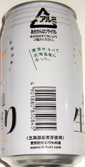 | 製造日 2005.10 | Hokkaido Namashibori 麦芽が、すべて北海道産になった。<北海道産麦芽使用>側面 | |