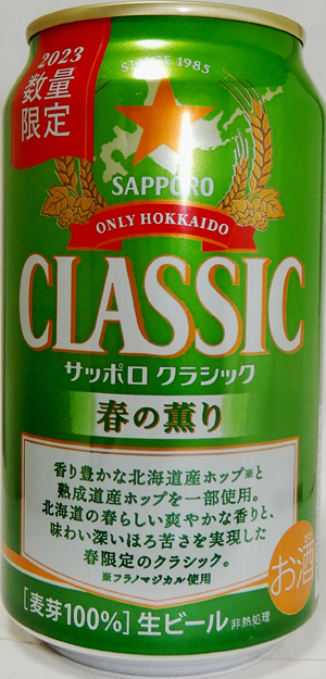 | 製造日 2023.3 | 2023 数量限定 裏面 薫り豊かな北海道産ホップと熟成道産ホップを一部使用。北海道の春らしい爽やかな香りと、味わい深いほろ苦さを実現した春限定のクラシック。 ※フラノマジカル使用 | |