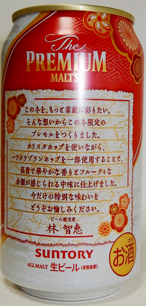 | 製造日 2022.8 | 裏面 ザ・プレミアム・モルツだから辿り着いたアンバーエール、限定発売。濃色麦芽と希少カリスタホップを一部使用した、芳醇でフルーティな味わいと、かろやかな余韻。 | |