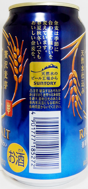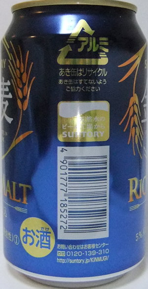 | 製造日 2013.12 | RICH MALT 天然水仕込 天然水のビール工場からSUNTORY 5% ALC.リキュール(発泡性)@ RICH MALTの下の麦のデザインが変わりました。 | |