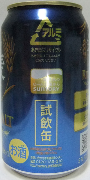 | 製造日 2011.12 | RICH MALT 天然水仕込 横面 厳選した「旨味麦芽」を主に使用。豊かな麦の旨味をお愉しみください。 天然水のビール工場からSUNTORY 5% ALC.リキュール(発泡性)@ RICH MALTの下の麦のデザインが変わりました。 | |