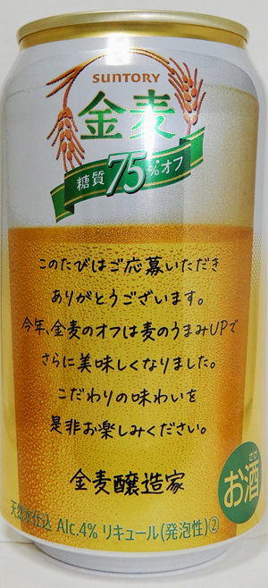 | 製造日 2020.4 | 裏面 それは、つくり手のこだわり いつでもおいしく楽しんでもらいたいから金麦のオフは季節ごとに味わいをととのえています。爽やかに仕立てた金麦のオフを夏の料理とお楽しみください。 | |