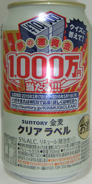 | 製造日 2015.1 | 天然水仕込 おいしい、のどごし。 クイズに答えて!夢の軍資金1000万円1名様に当たる!!! 5% ALC. リキュール(発泡性)① 裏面 | |