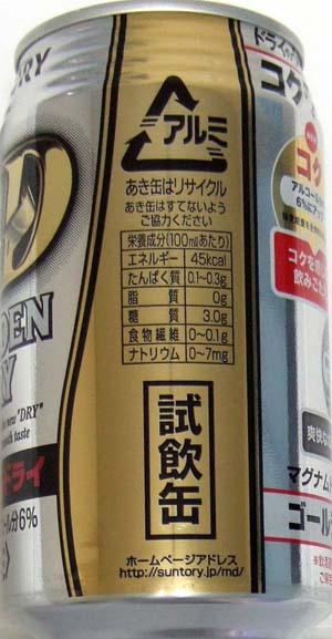 | 製造日 2006.12 | 発泡酒 アルコール分6% GOLDEN DRY is the new "DRY" with rich and smooth taste 天然水100%仕込 | |