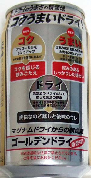 | 製造日 2007.1 | 裏面。ドライのうまさの新領域 コクうまいドライ! マグナムドライからの新提案 ゴールデンドライ新登場!! *飲酒運転は法律で禁止されています。ご帰宅後にお飲みください。 | |